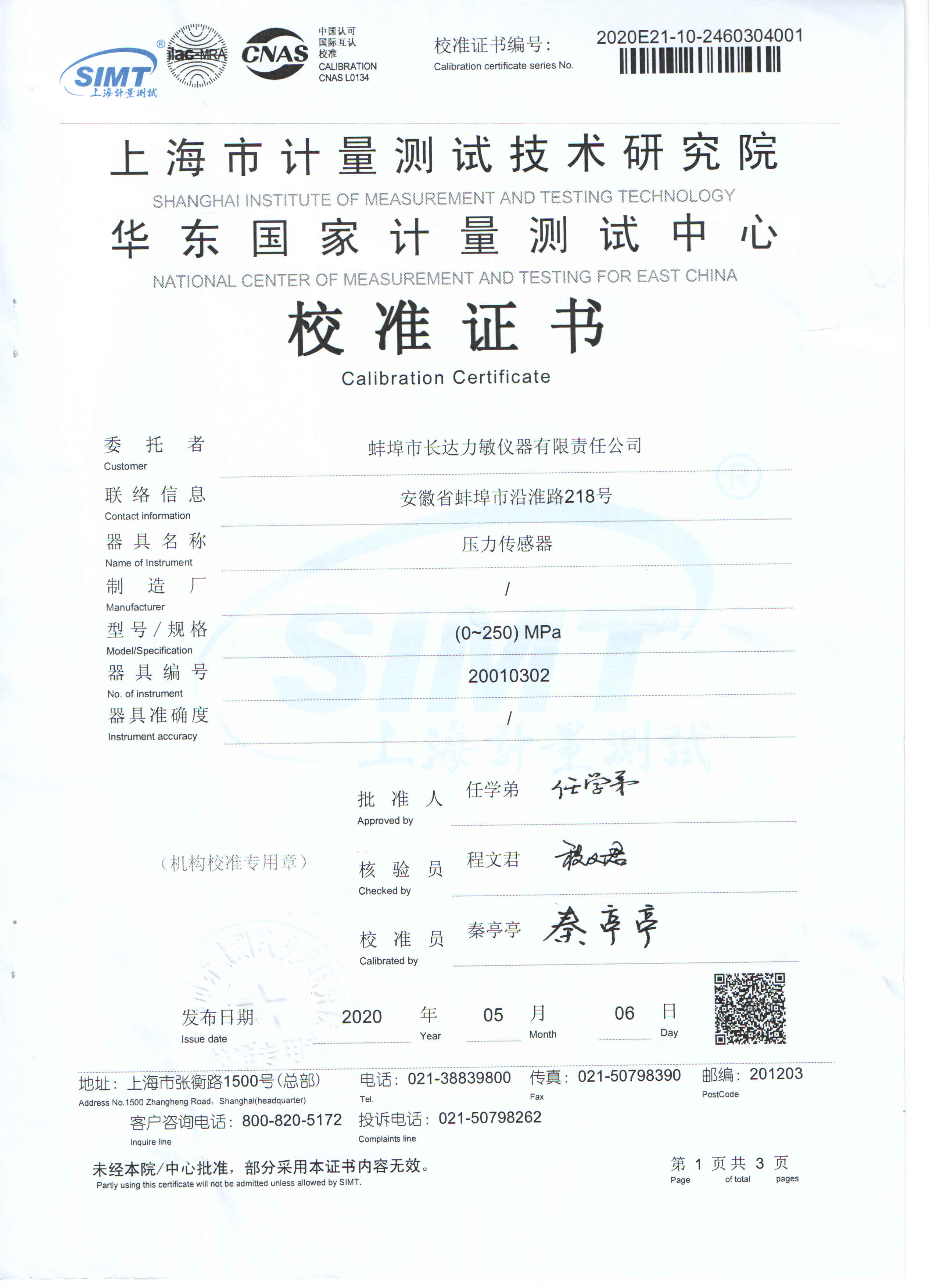 250MPa校準(zhǔn)證書